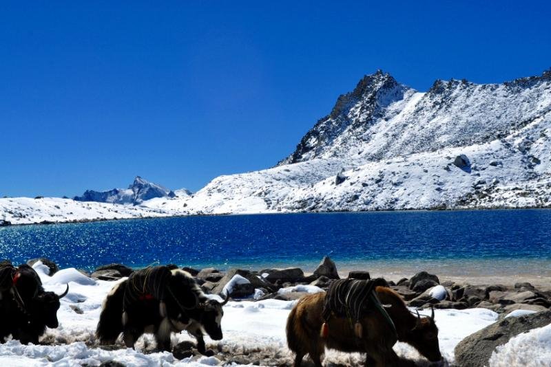 This demanding route winds through diverse landscapes, from yak herders’ camps at 3980 m to the grazing grounds of Blue Sheep, remote villages like Laya and Thanza, and across numerous daunting passes such as Nyeli La (4890 m), Jhari La (4747 m), Shingela (5005 m), and Jaze La (5050 m). Campsites are nestled near scenic wonders like Tsho Chena Lake (4800 m) and Thampe Tsho (4200 m), offering breathtaking views of Mt. Jomolhari (7314 m), Masagang (7165 m), Table Mountain (7100 m), and Gangla Karchung (6395 m).
